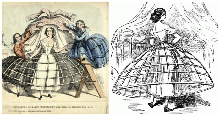 Por incrível que pareça, a crinolina foi a primeira peça de roupa usada por todas as classes sociais. Feita de barbatana de baleias e, mais tarde, de aço, a crinolina funcionava como uma gaiola (ironicamente, cage, em inglês) que podia chegar até 3 metros de largura, coberta com várias camadas de anáguas, para suavizar e disfarçar a estrutura.
