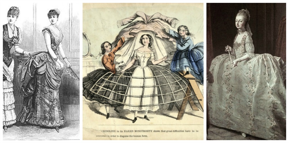 Os pannier, ou ancas, eram estruturas imensas feitas de barbatanas de baleia ou galhos de vime/salgueiro usadas por baixo das saias, que se estendiam por até 3 metros para os lados.